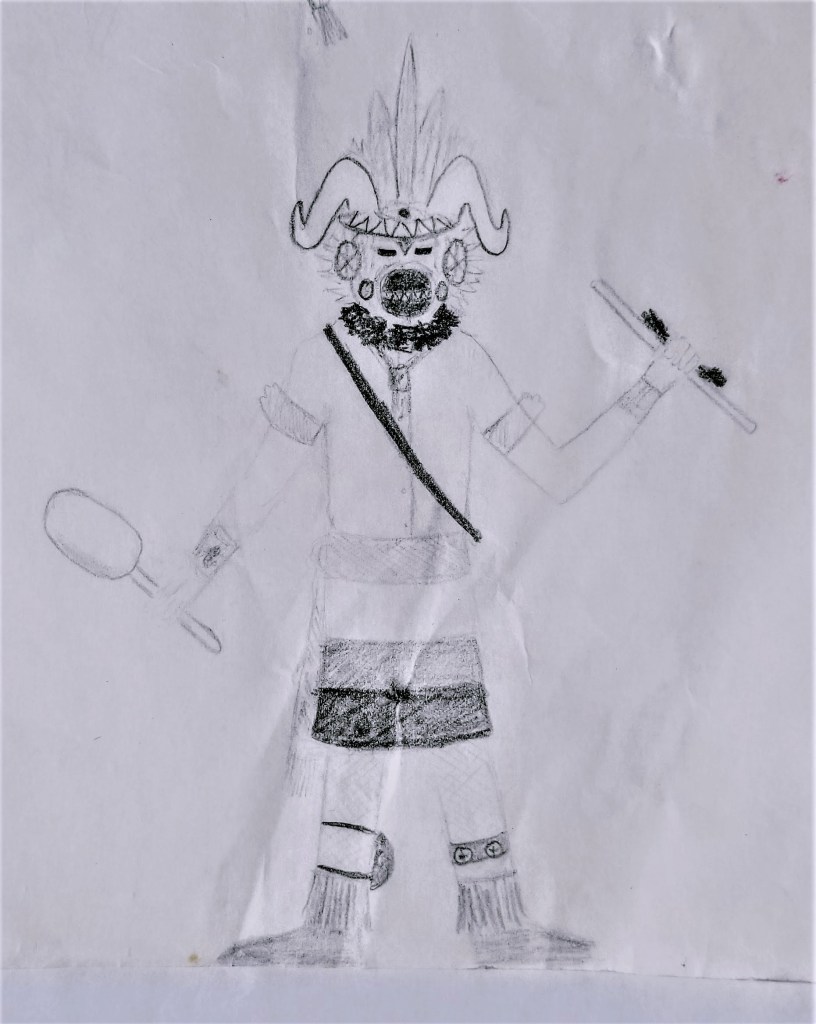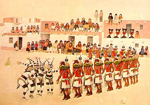 The black-and-white figures are Kosharis, or Hopi clowns.