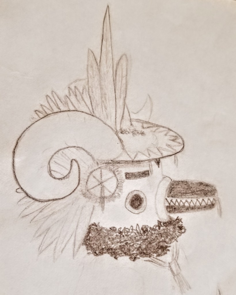 When I got back to the trailer that night, I sat down and sketched out a ram dancer. I had tried to remember every detail of their incredible costume. I rediscovered it the other day; the headdress is above. I will never ever forget that day!