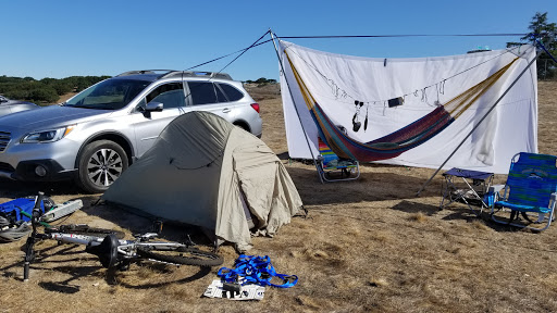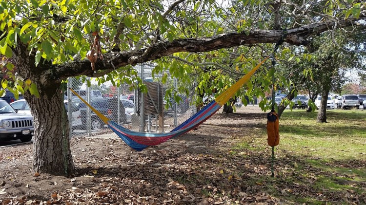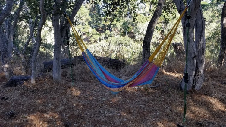 Having heard a picture is worth a thousand of these wee rascals that have to be typed and spellchecked, what follows is an array of places and situations where I have set up a “sling.” I admit to always seeking out a spot to set up, even when I do not have a hammock with me – a somewhat rare occurrence. Trees, fences, signposts, and solar array supports, increasingly common in California parking lots, are all fair game.