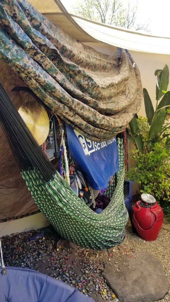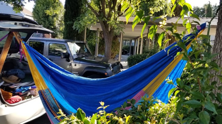 Above is a car sling just out the back of a hotel. A sunshade provided additional comfort. I always prefer to tie up to non-trees in these situations, as no one could accuse me of damaging branches or trees. I was once accused of “stressing the guests” by a hotel clerk who – eventually – determined I was not a threat, or a vagabond, but actually a registered guest who just wanted to be out in the fresh air.