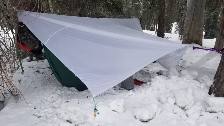 For a few years, I have been an Ookpik Instructor for the Boy Scouts. We teach adult leaders how to safely camp with the troop in the winter. This photo shows the Silnylon hammock tarp my wife helped me create, with turnbuckles at each end to transfer the weight from the tree down to the hammock, and still keep the rain out. I have another tarp wrapped around from below to keep some of the breeze out – the “Taco Tent.”