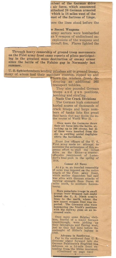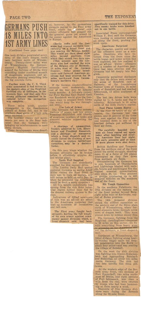 December 14, 1944: Germans Push 18 Miles into 1st Army Lines – describes fighting near Wissembourg, near what had been rebuilt of the French Maginot line. “The heaviest enemy rail movements yet seen in the Saar indicated that the Germans were bringing up reinforcements to meet these threats.” Berlin Radio said “the Germans had crossed northern Luxembourg on a broad front,” and “enemy broadcasts said forward American positions had been overrun for 20 miles northward from Luxembourg’s northern tip.” The paper goes on to indicate that if the “German counteroffensive succeeds even moderately, the end of the war may be delayed many months . . .” and “. . . drag the war throughout 1945.” The Germans were feeding “heavy concentrations of armor into key points. Frontline dispatches told bluntly of enormous numbers of tanks and armored vehicles supporting the infantry.”