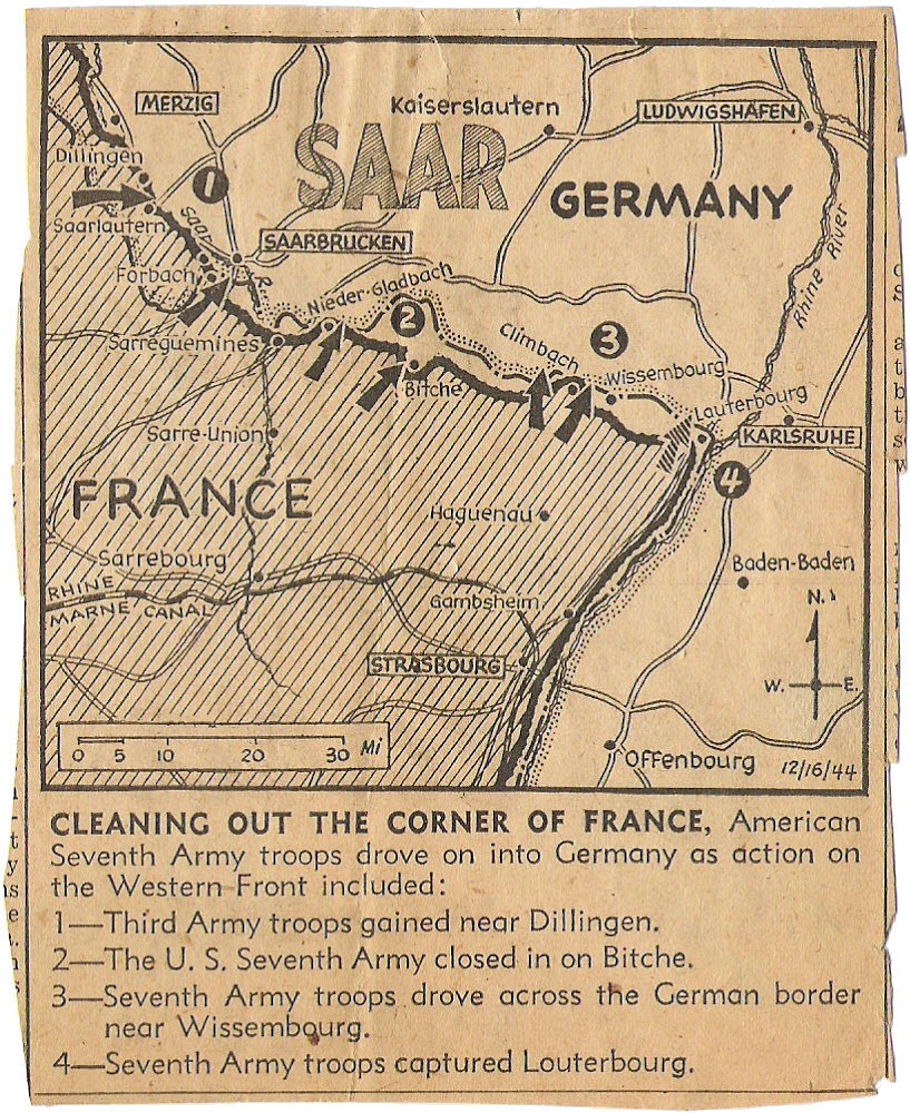 A final map shows the progress of the Third and Seventh Armies as they “clean out the corner of France and head toward the Saarland,” dated December 16, 1944.