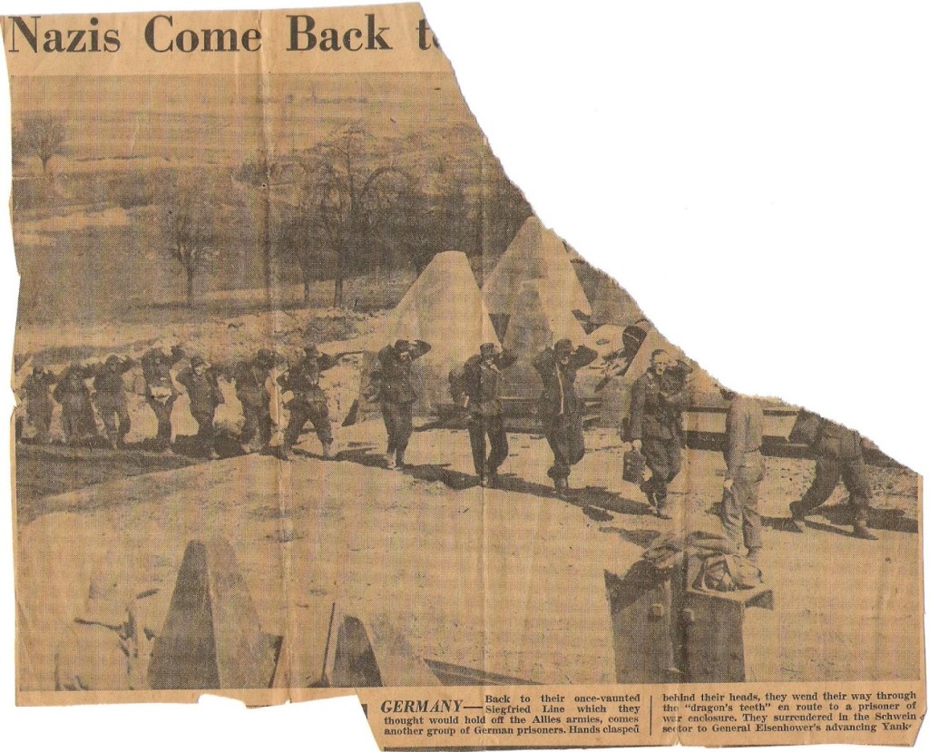 A photo shows ” . . . another group of German prisoners. Hands clasped behind their heads, they wend their way through the “dragon’s teeth” [of the Siegfried Line] en route to a prisoner of war enclosure . . .”