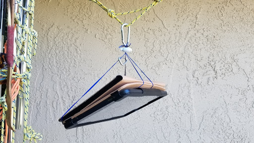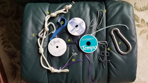 B. Another item I have described before is the ladder knot, shown here on a short piece of rope. Things can clip in easily along the length, and it can be suspended vertically or horizontally.