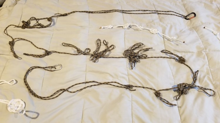 Eventually, I developed an indoor hammock, an outdoor hammock, and a travel hammock. The travel version fits in one stuff sack and has the basics – tree straps, the rope shelf or yippie line, and hammock. The indoor hammock sits right by the bed, and is essentially a storage mechanism for my life. Wallet – it’s hooked in over there, glasses, remote controls, chargers, tablets, television, stereo (with switch so I can go from tablet sound to TV and back), hats, bottles for water and wine, lots of electrical outlets to manage all of this…