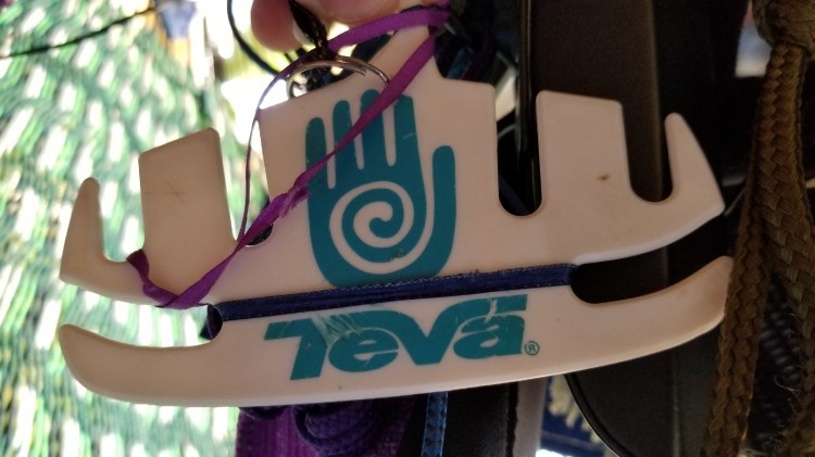 I used to wander (read lurk) in stores, hunting for hooks, sock clips, links, and other flotsam left after a busy shopping day. The less organized the store, the better the pickings were. The gold standard has always been the Teva sandal slinger, an antleresque array of hooks. I have seen recently that they are using more cardboard – which is good for the environment but not so good for hammock inhabitants.