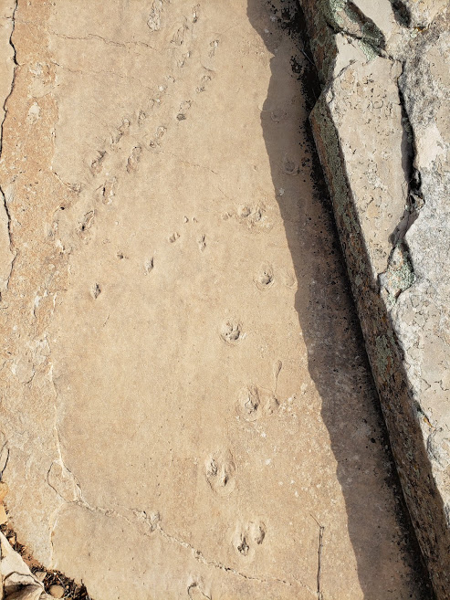 The Coconino sandstone is a beautiful almost white cake of prehistoric sand. Once the Trail dropped below that level, slabs of the stuff were everywhere, revealing the ripples and details of prehistoric desert. If one searches for a while, it is quite common to spot the fossilized tracks of critters that once skittered across the ancient sands.